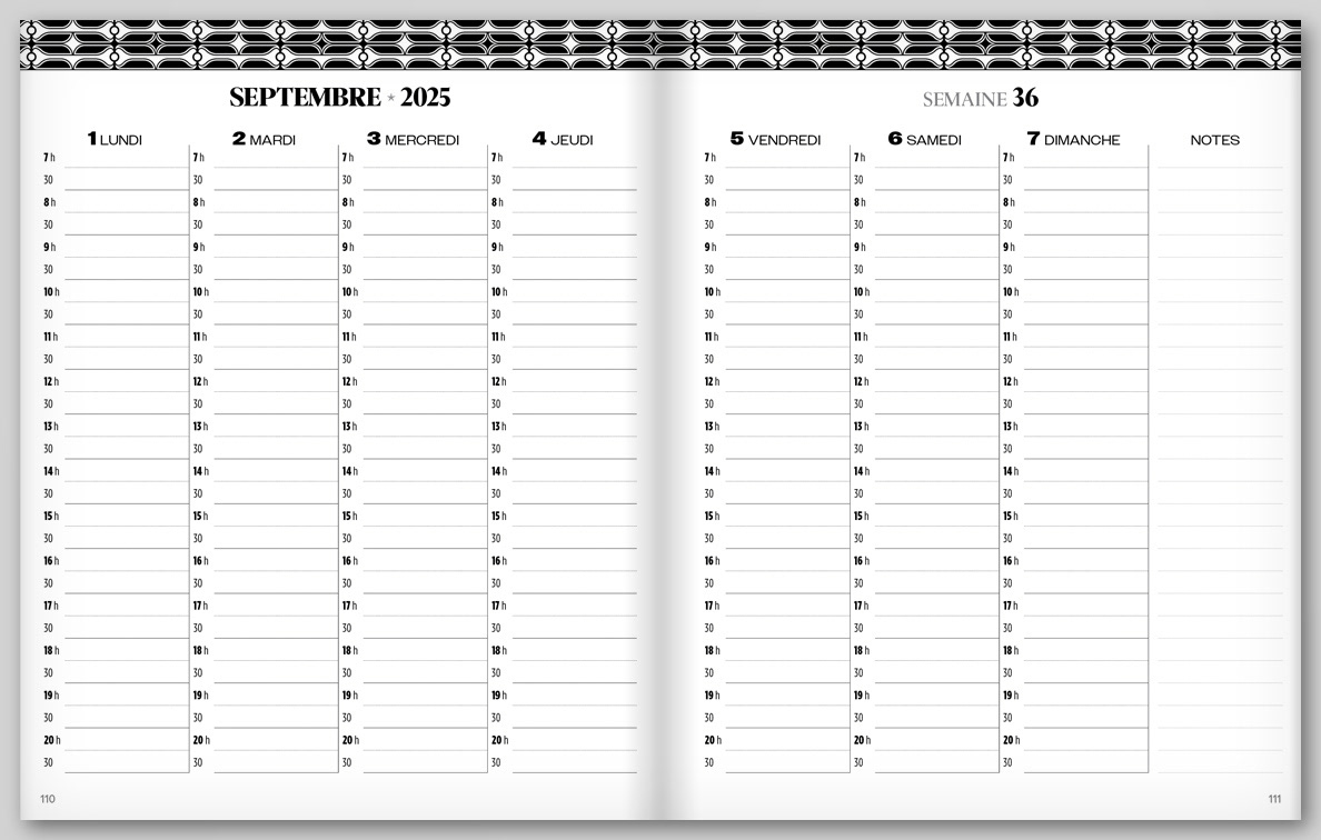 Double page pour chaque semaine • Journée complète pour les fins de semaine