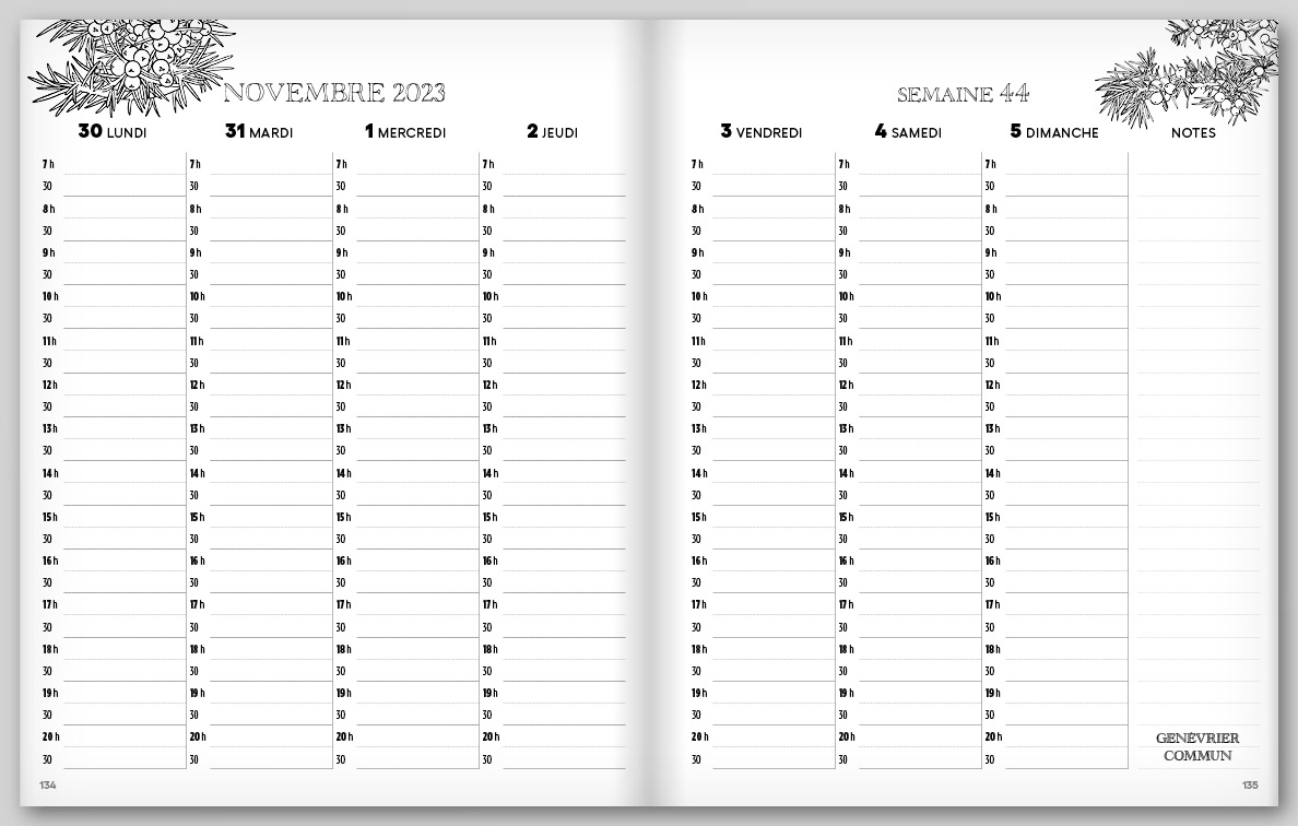 Double page pour chaque semaine • Journée complète pour les fins de semaine