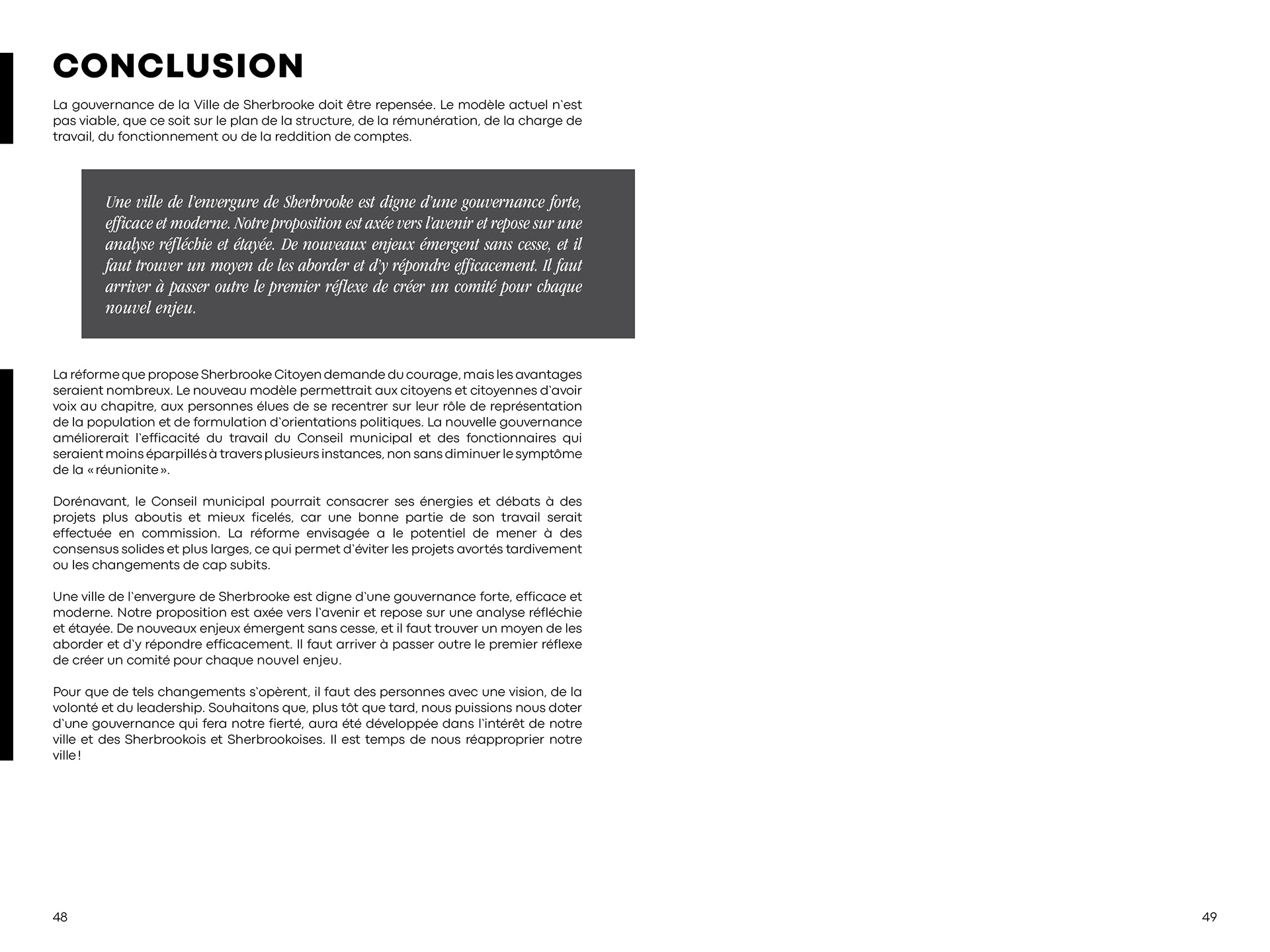 Pendant la campagne électorale de 2021, Évelyne Beaudin et son équipe de Sherbrooke Citoyen ont rédigé un livre réunissant leurs propositions pour moderniser la gouvernance à Sherbrooke.