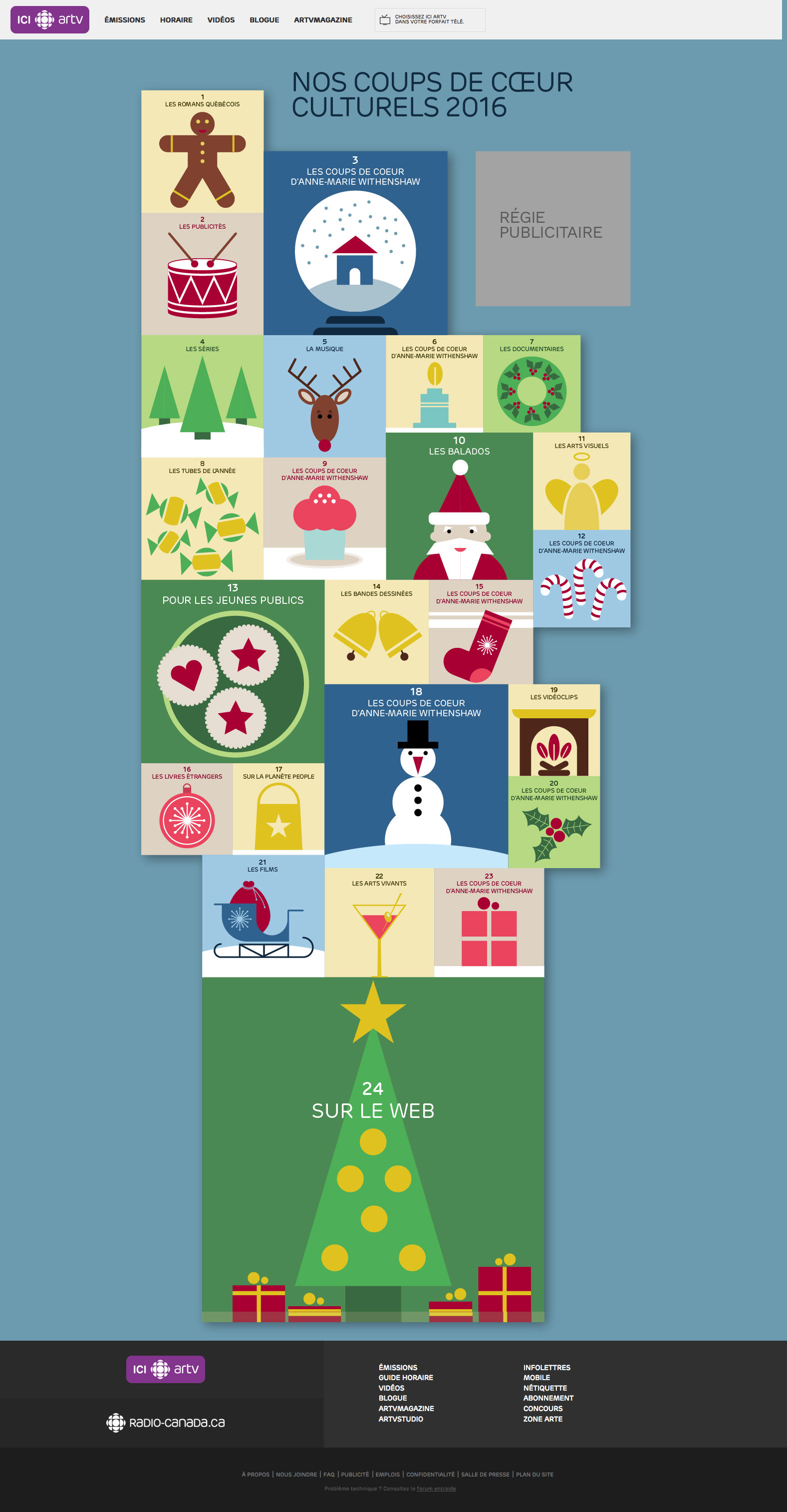 Calendrier de l’avent, chaque jour une case s’ouvre pour donner accès sur le blogue de la chaîne à une nouvelle liste de coup de cœur. Dans cette version toutes les illustrations sont des Gif animés qui s’anime lorsqu’on passe la souris sur les cases.